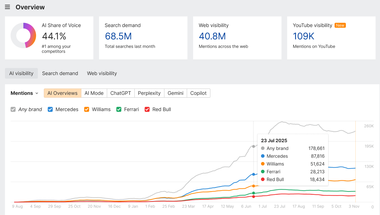 I can search instantly, analyze any domain, and benchmark AI “share of voice” across models like ChatGPT, Copilot, Gemini, Perplexity, and AI Overviews.