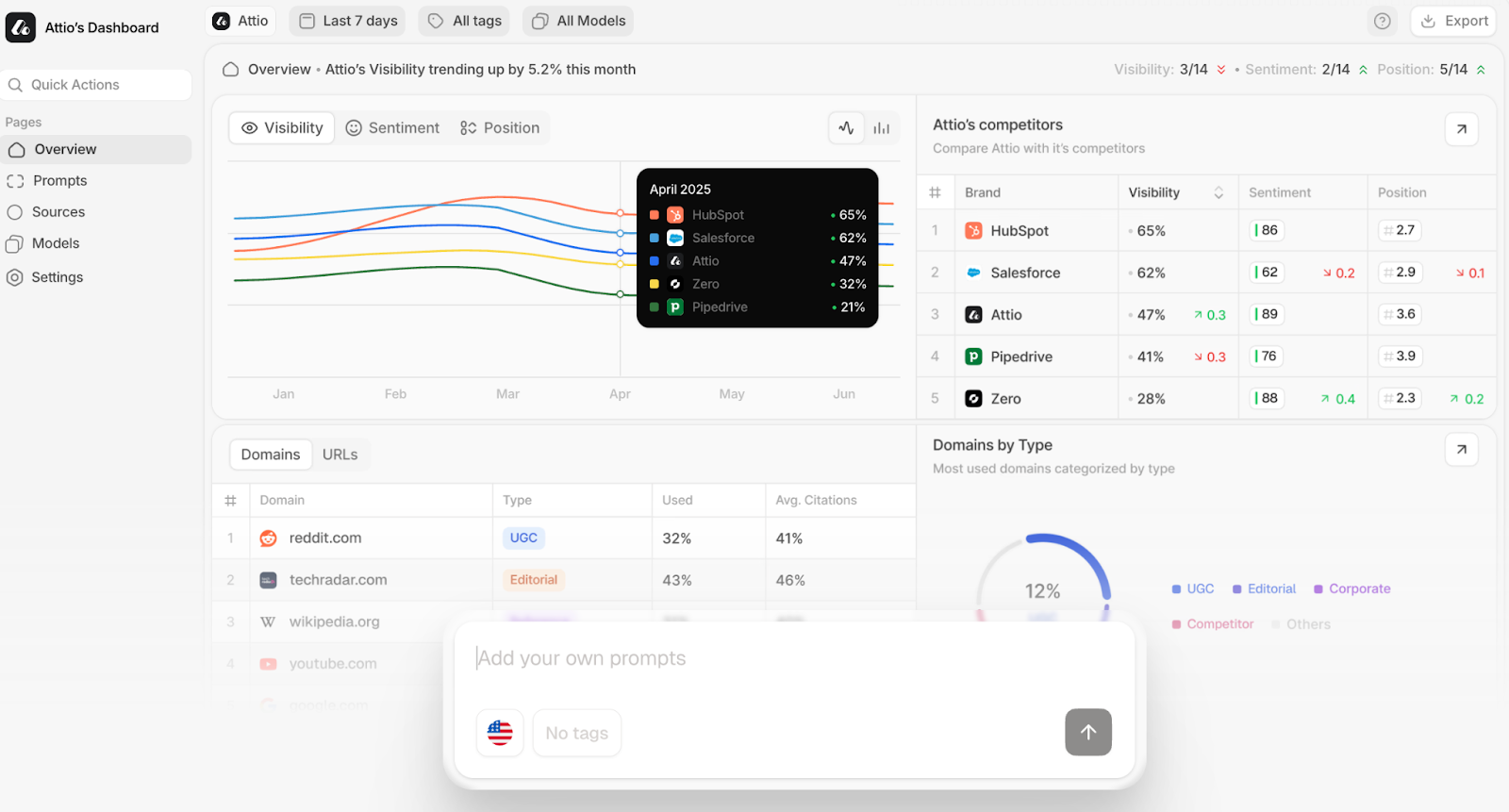 The platform monitors real brand visibility across ChatGPT, Perplexity, Gemini, Claude, Google AI Overviews, and other models. It shows where your brand is mentioned, how competitors are positioned, and how AI systems describe each company in their responses.