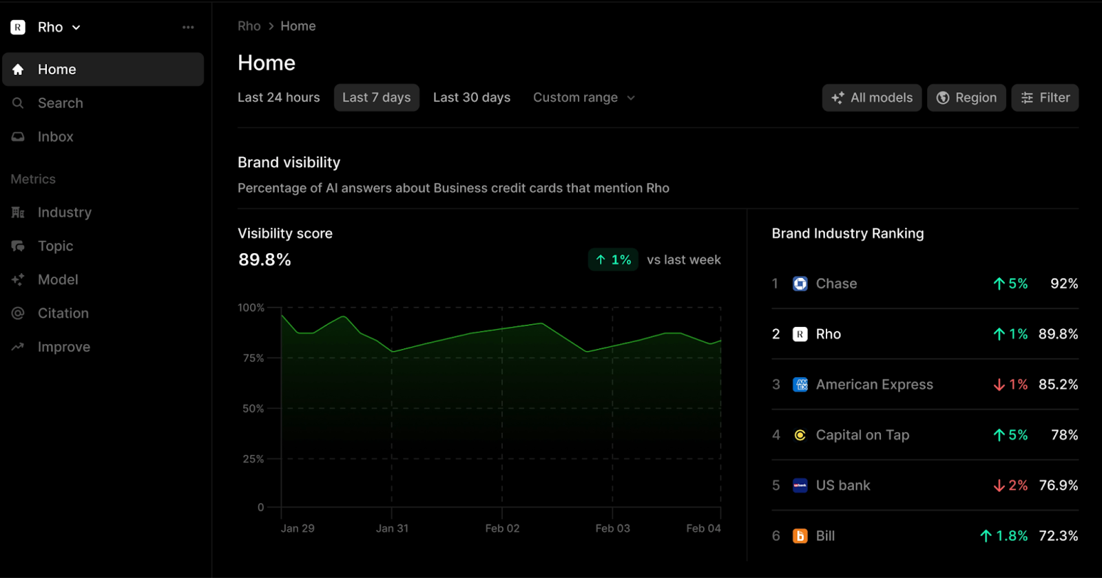 It shows how often a brand appears in AI responses, what AI is saying about it, and which sources are driving those mentions.