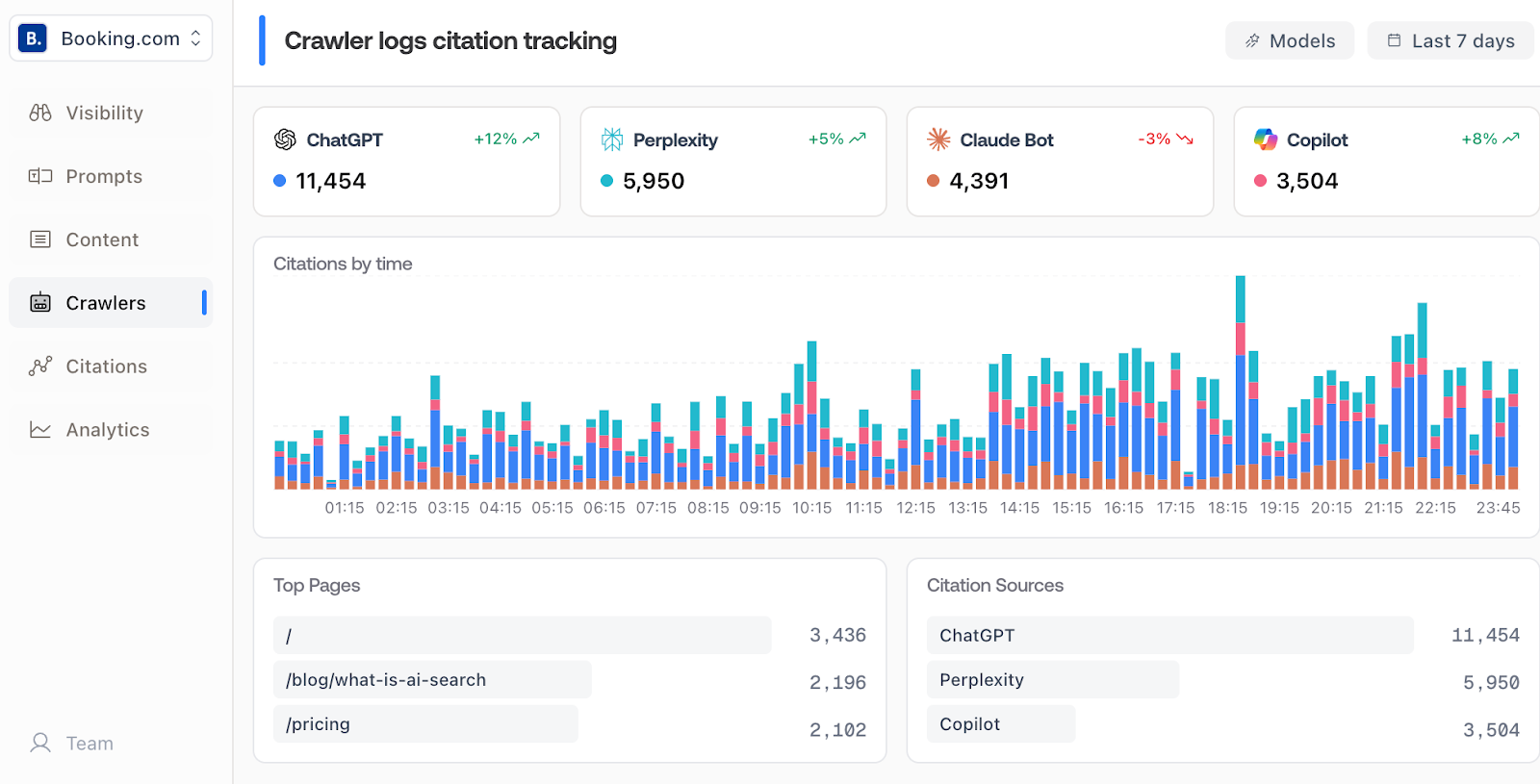 Promptwatch goes deeper into crawler logs, citations, and real AI responses, rather than higher-level visibility summaries. You can see which pages AI crawlers read, when they crawl them, and how that content ends up inside AI answers.