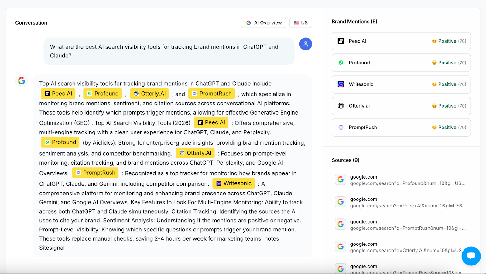 The UI is very clean and simple, which helps you check performance quickly across models, regions, and prompts. If you want a tool that shows what is happening in AI search and why, Peec does that well.